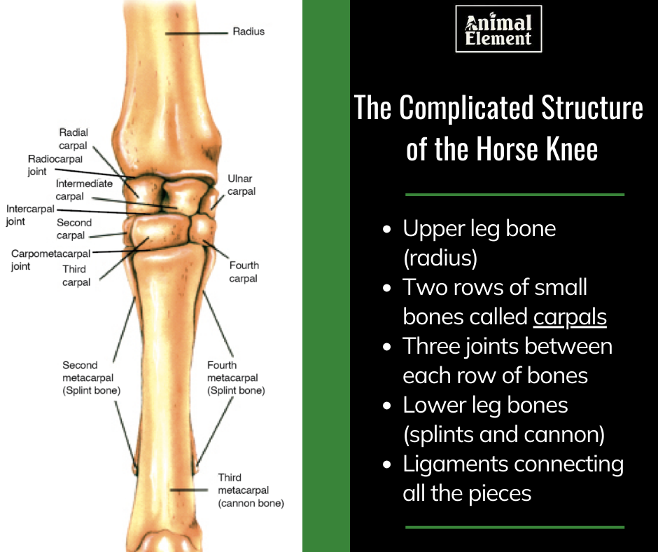 Horse knees are not as straightforward as human knees. They are composed of several small bones, called carpals, in two rows between the radius (above the joint) and splint and cannon bones (below the joint). They connect at three different areas called the radiocarpal, intercarpal, and carpometacarpal joints. All bones of the carpus (knee) joint are connected with ligaments. These ligaments work as stabilizers as well as shock absorbers when the joint is in motion. [1]