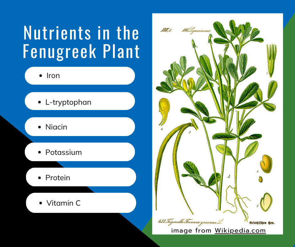 - Fenugreek is rich in protein (builds muscle and bone), easily digestible iron (carries oxygen in the blood), Vitamin C (strengthens the immune system & fights free radicals), potassium (helps with muscle contraction and hydration), niacin (a B vitamin that turns food to energy), and L-tryptophan (helps create protein and serotonin). [1]